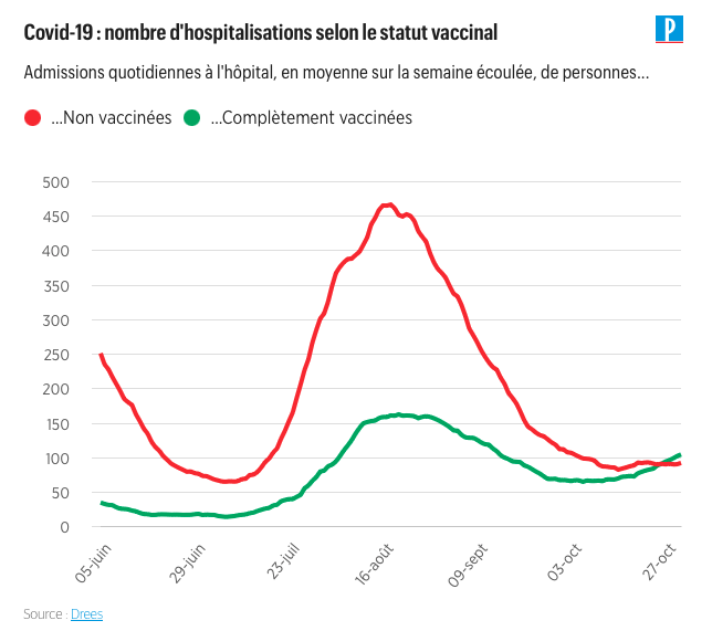 Fin octobre 2021, le nombre de personnes vaccinées du covid dépasse le nombre de personnes non vaccinées dans les hopitaux français :