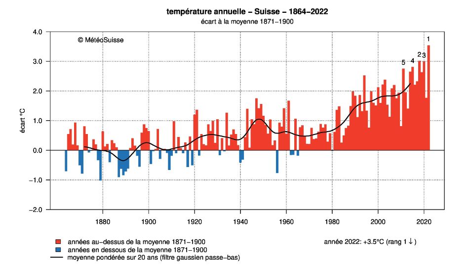 Remarque 1 : Ces valeurs de CO2 dans l’atmosphère peuvent paraître faibles, mais voici l’augmentation moyenne de température en suisse depuis 1880, on peut en particulier regarder la période 1960-2020 :