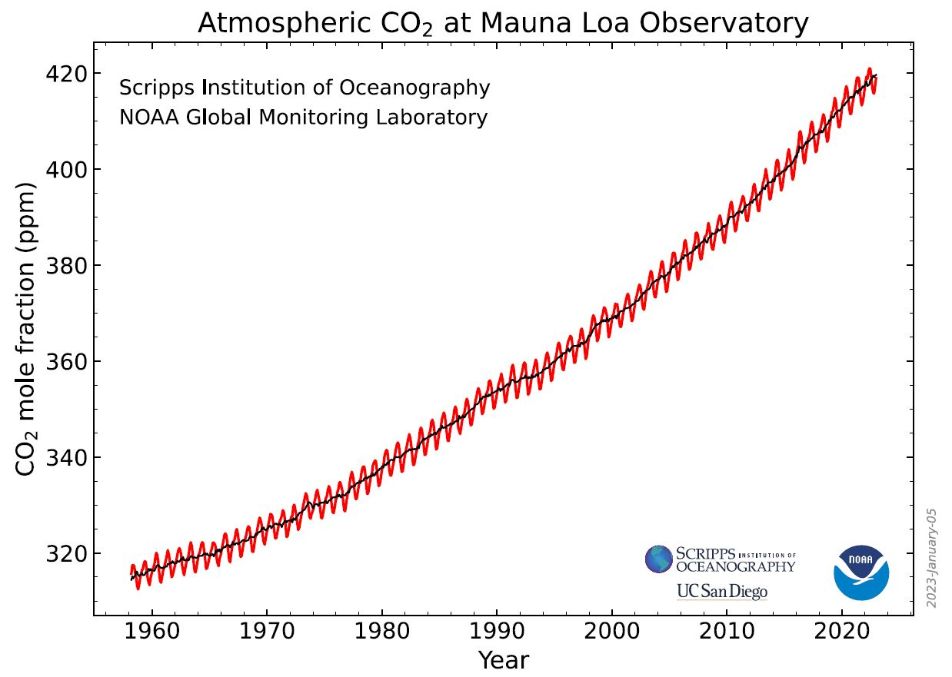 L’augmentation de la température moyenne à l’échelle de la Terre est directement liée à la quantité de CO2 émise par l’homme. Une partie du CO2 émis est absorbé par les plantes, une autre par l’océan et l’atmosphère. On peut donc mesurer la quantité de CO2 contenu dans l’air pour suivre l’évolution du climat. Celle-ci se mesure en ppm : partie par millions, par exemple 1 ppm signifie que dans l’air, une molécule sur un million est une molécule de CO2. Voici ce que la station de Mauna Loa (Hawaï) a mesuré entre 1960 et 2020 :