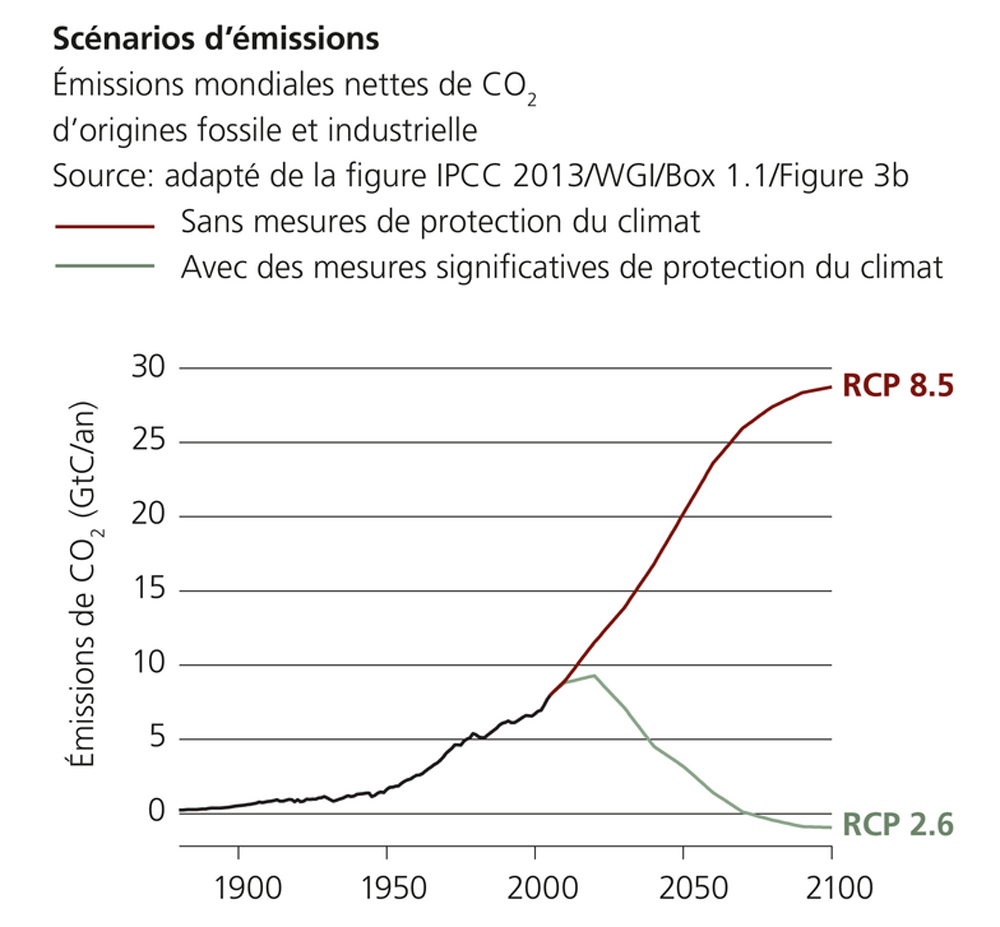 L’augmentation de la température moyenne à l’échelle de la Terre est directement liée à la quantité de CO2 émise par l’homme. Cette émission est mesurée en GtC/an : Gigatonne de CO2 par an. Le GIEC (Groupe d’Experts Intergouvernemental sur l’évolution du Climat) prévoit deux scénarios pour l’évolution de cette quantité de gaz : soit sans mesures de protection du climat (RCP8.5), soit avec des mesures significatives de protection du climat (RCP2.6) :